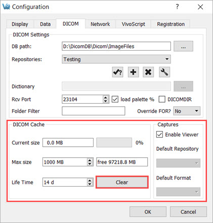 Alternatively, you can clear the cache directly on VivoQuant by navigating to Tools → Configuration → DICOM, and hitting the Clear button in the DICOM Cache section.