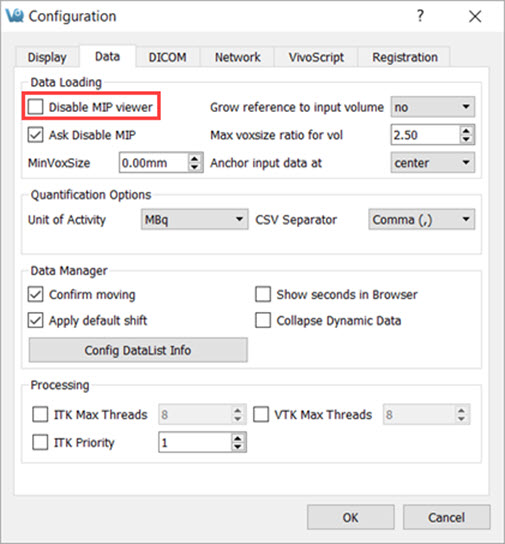 If you can’t see the MIP view or 3D rendering of your data, make sure that MIP Viewer is enabled the in your VivoQuant instance. To do this, navigate to Tools → Configuration → Data, and uncheck the Disable MIP viewer check box.