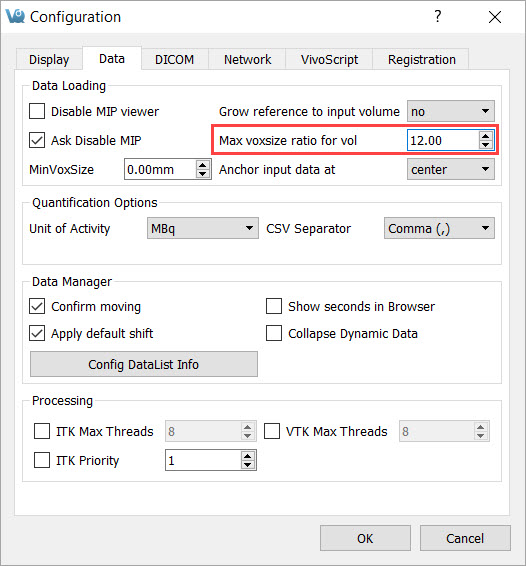 If you notice that your images appear distorted, they might be loading as planar images. If the voxel size ratio for a non-planar image is greater than your configured maximum ratio, VivoQuant forces the image to load as a planar image. Increasing this maximum value will prevent this distortion.