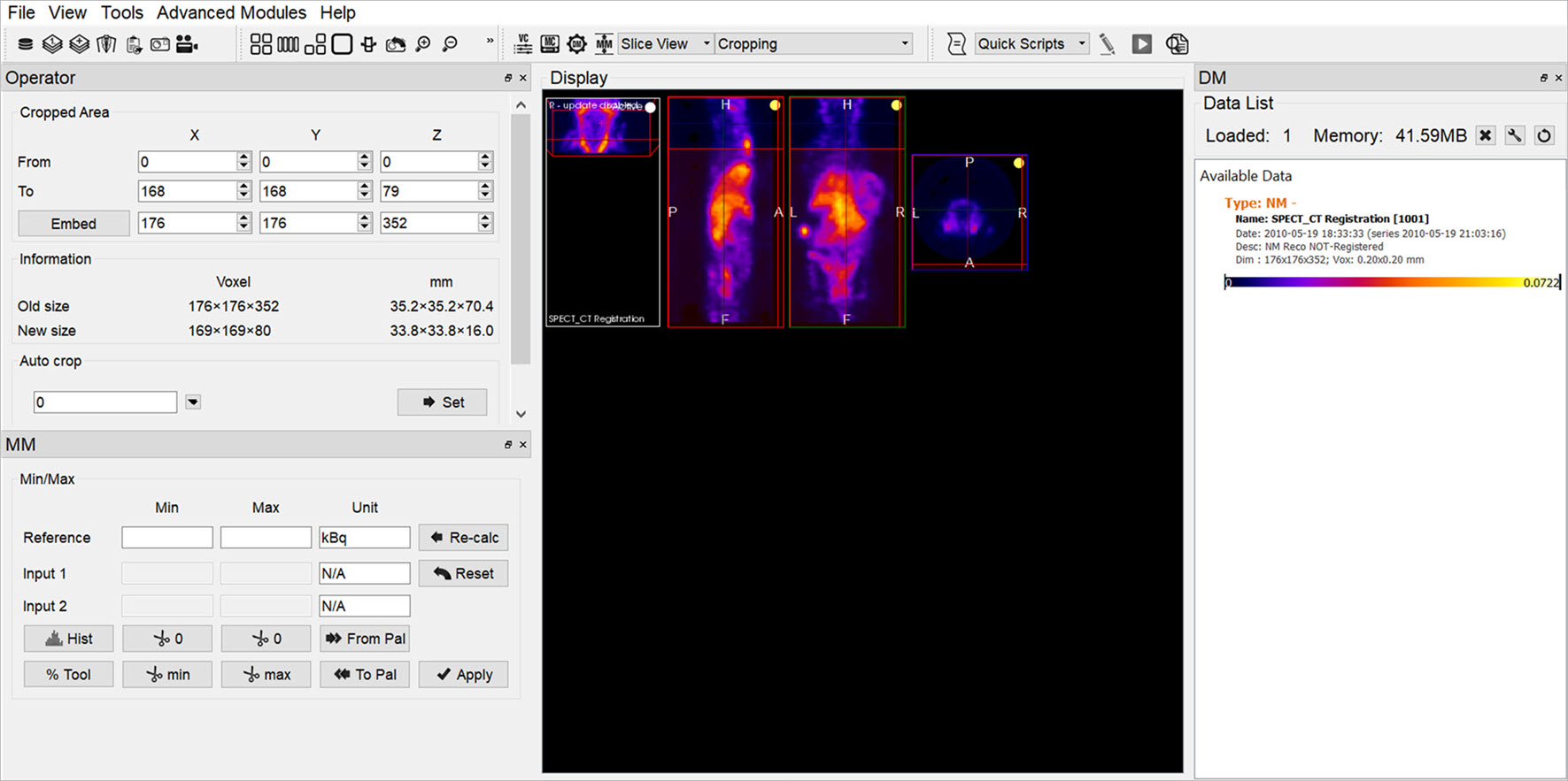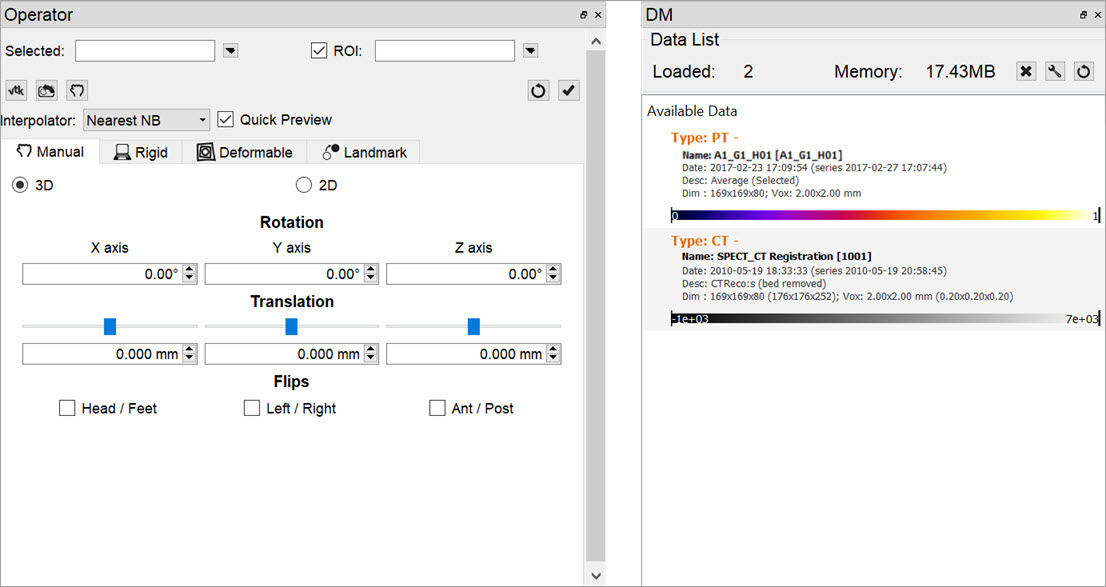 The Viewer Control, MIP Control, Data Manager, and all Operators are automatically placed into docks upon opening. Docks may be dragged and dropped into and out of the Main Window display and multiple Controllers are dockable at any given time.