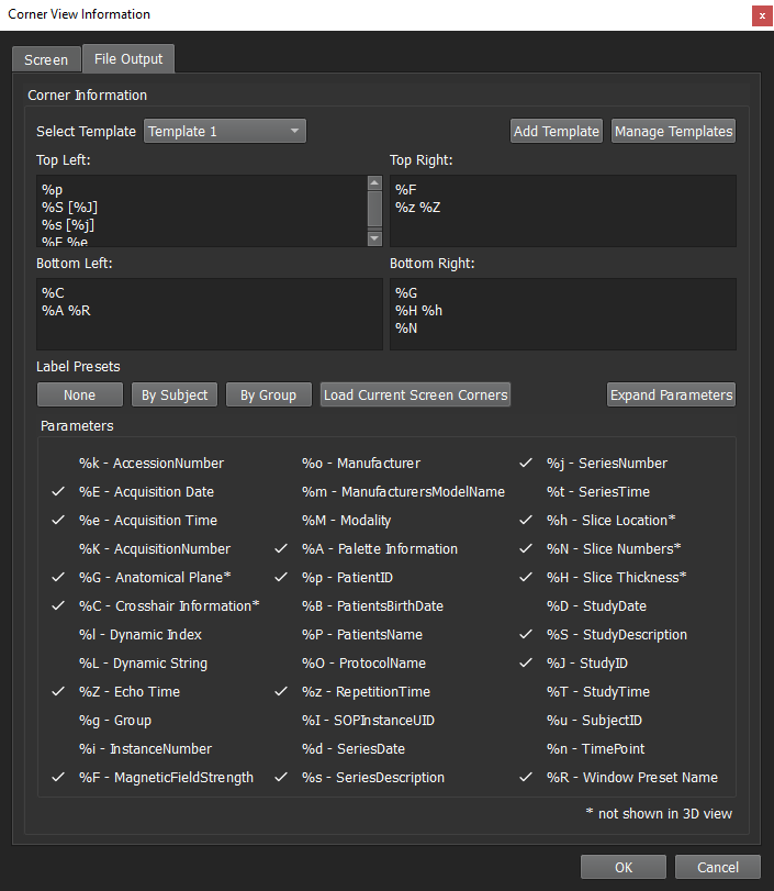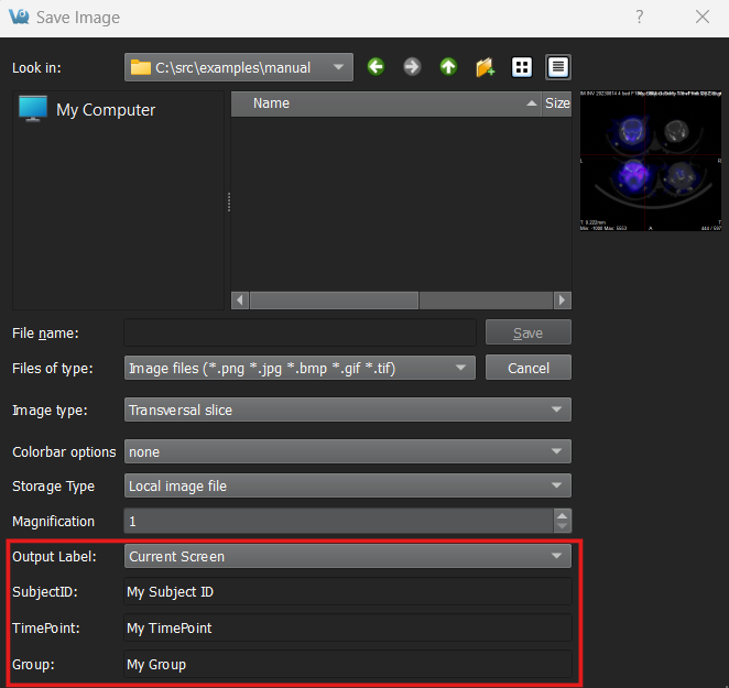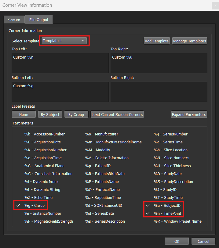 Three customizable corner fields can be changed via the Save Image and Save Movie dialog. These custom fields are: SubjectID, TimePoint, and Group. If any of these field parameters are present in the currently selected corner view template then the corresponding editable text fields will show up in the save dialogs. This time saver allows for quick label adjustments. Although these three field names are specific, anyone can use them for their own custom information; the three names are only mappings from the corner template to these save dialog fields.