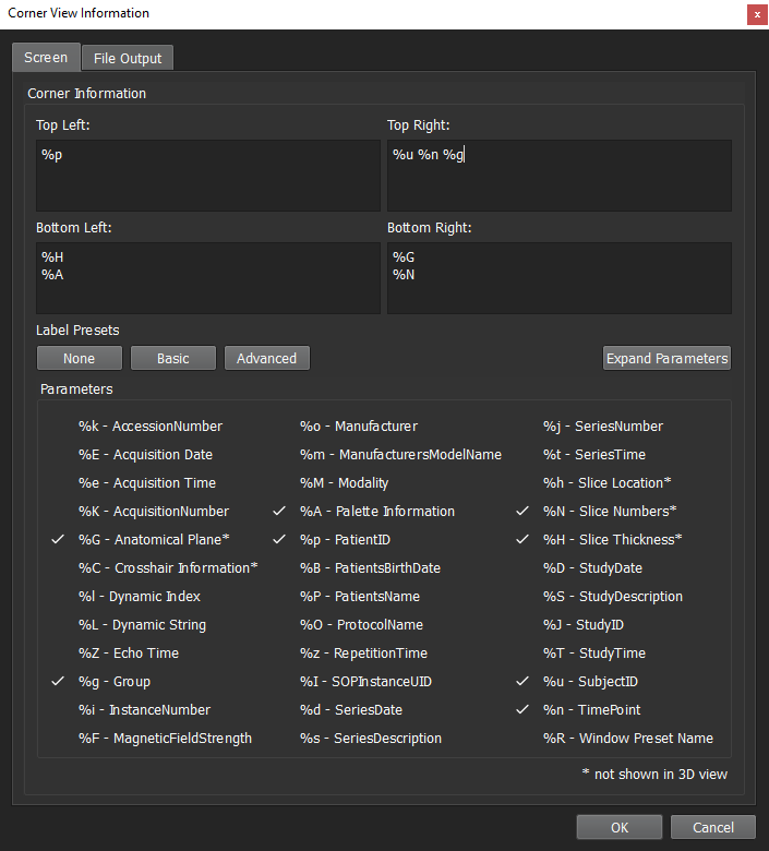 The Corner View Information is organized into two tabs: one for information shown on the screen view and one for information that will show on the image when it is saved out. The corner information is organized into the four corners of the image as can be seen in the corresponding four editable text areas. These text areas support a combination of regular text input and also field expansion by the use of tokens prefaced by the percent character. As you add tokens a helpful check mark will be shown next to the field indicating that it is included in one of the four corners. We also have added a helpful Expand Parameters button so you may more easily read through the included fields. Also included are three preset buttons for common corner view settings: None, Basic and Advanced. These were determined by Image Analysts to be commonly used templates; which can be configured through the registry settings.