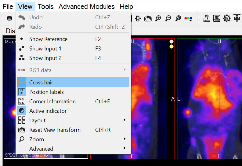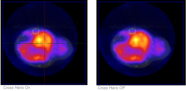 The Cross Hairs are displayed over each cross-sectional image: sagittal, transversal and coronal. To display the cross hairs in the images, go to the View menu and select Cross Hair. To conceal the cross hairs from view, unselect the Cross Hair functionality by left-clicking on it.