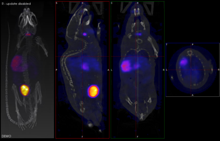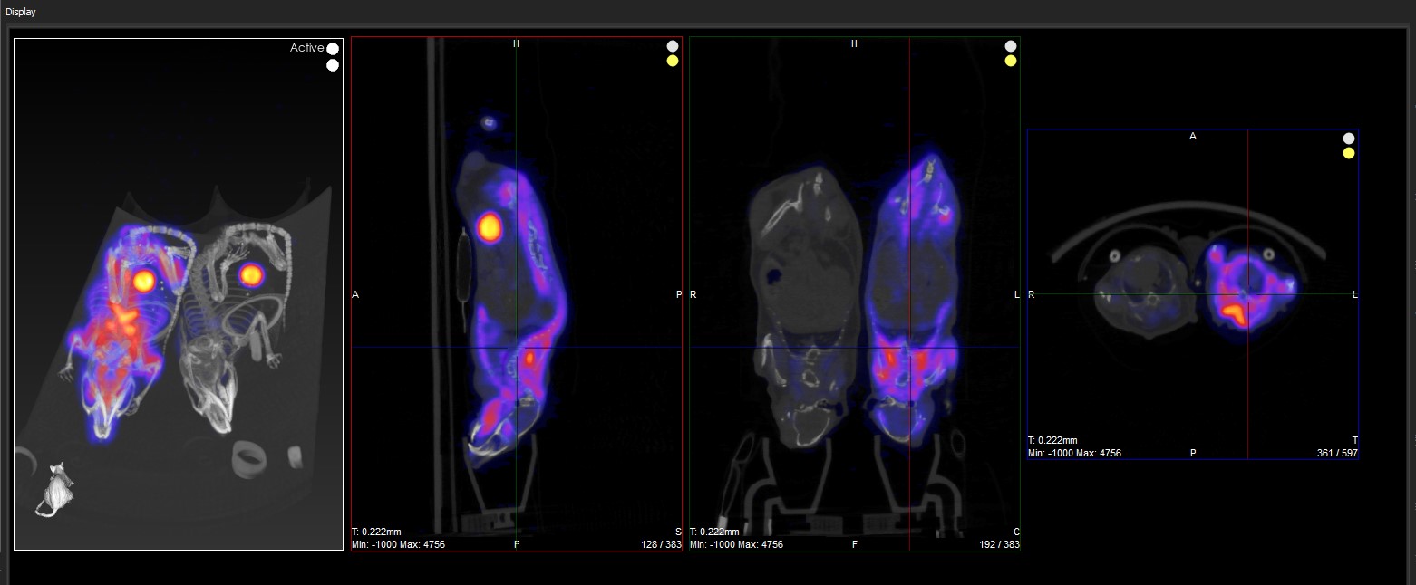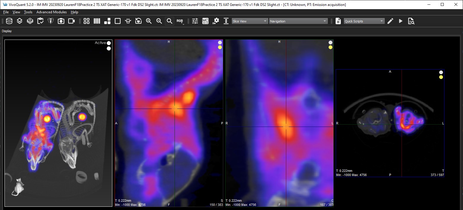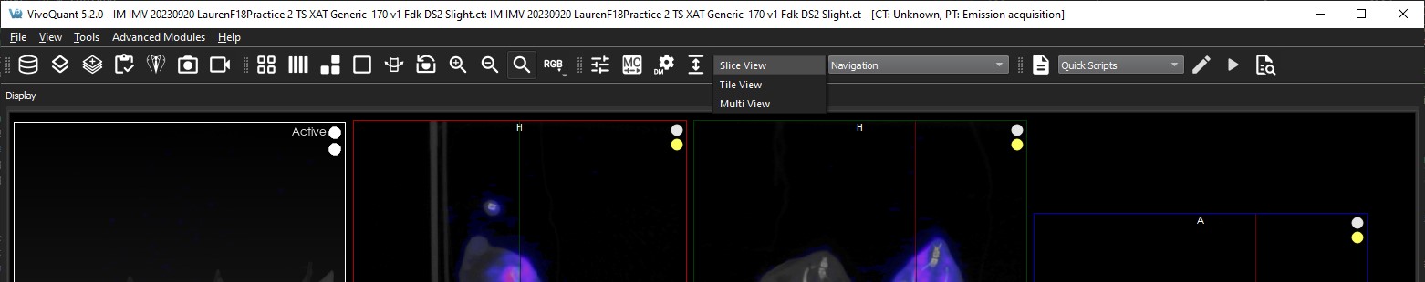 The Slice View (default) simultaneously displays images of single slices for the sagittal, coronal, and transversal views of the loaded data sets.