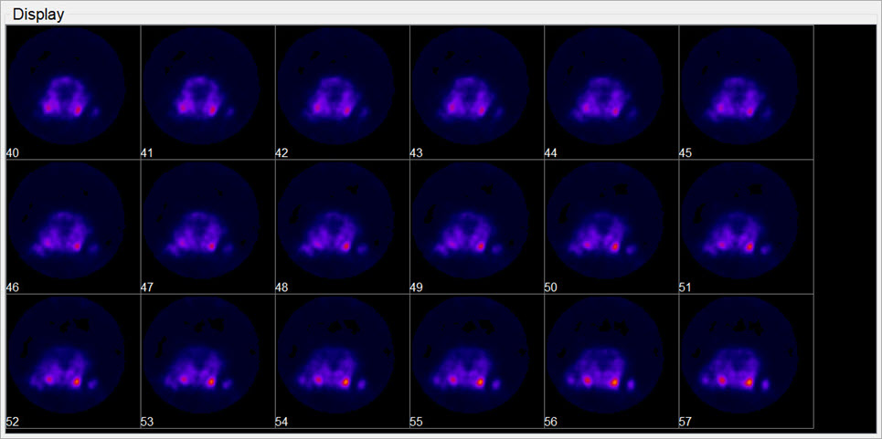 The Tile View displays an array of slices for either sagittal, coronal, or transversal view of the loaded data sets. The number of slices displayed depends on the size of the VivoQuant window.